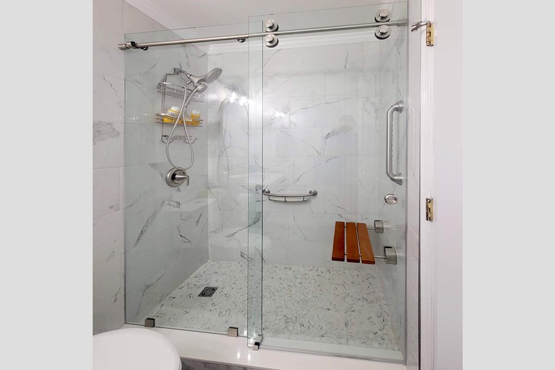 Space-efficiency meets modern elegance on this frameless sliding shower door system. Here, chrome hardware enhances the bathroom’s cool ambiance and coordinates nicely with the futuristic style of the header bar and rollers. Sliding shower doors like this are perfect for bathrooms where another fixture near the shower makes a hinged door impractical.