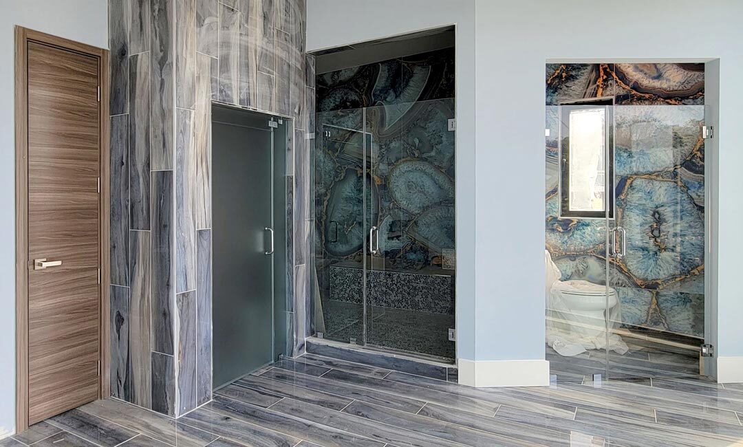 Check out the unique and beautiful shower wall tile in this bathroom! Two hinged clear glass doors ensure that this special tile remains visible from outside the shower, while frosted glass on a third door provides privacy. In addition to taking this approach, you can also include both clear and frosted glass by: