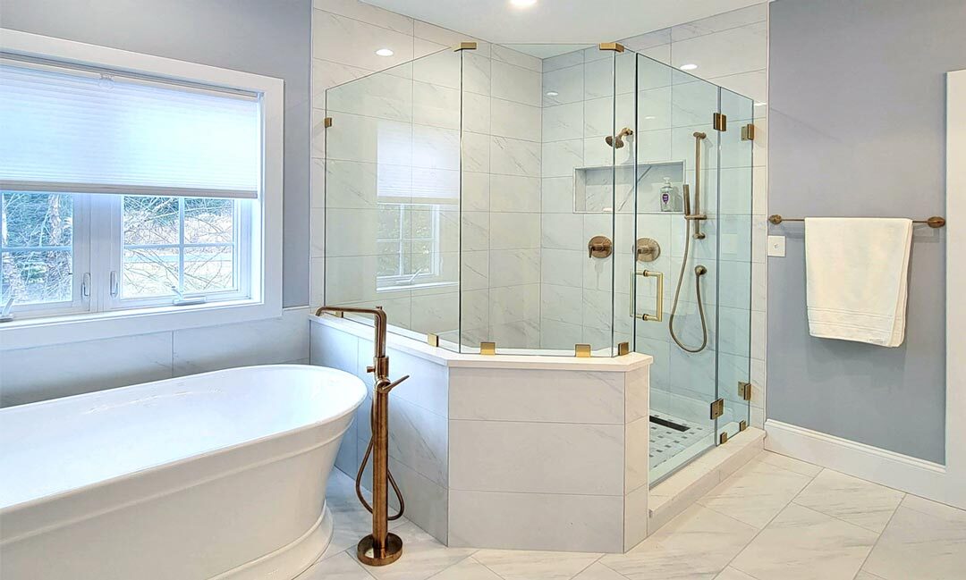 This special corner shower showcases a custom layout and clear glass. The choice of a brass hardware finish adds a luxuriant touch to the whole shower area. From the mitered pull handles to the glass-to-glass hinges every component comes together to create a truly impressive corner shower! As is often the case in newer bathroom remodels, this stall is also partnered with a separate soaker tub.