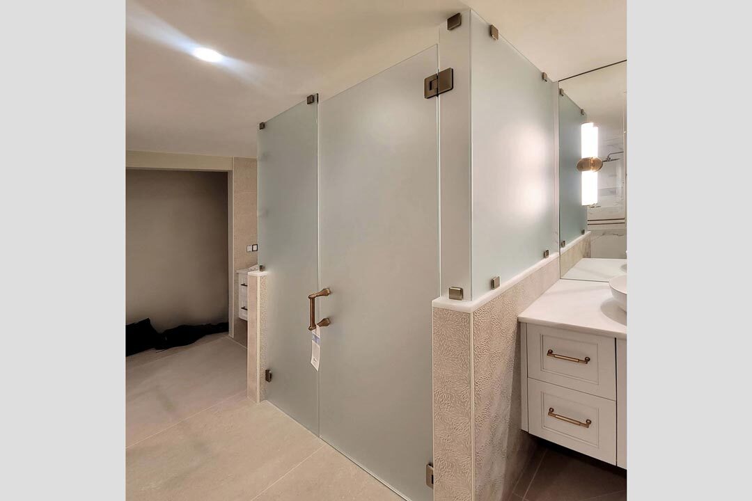 - Having glass custom sandblasted so that part(s) of it are frosted and other sections are clear.