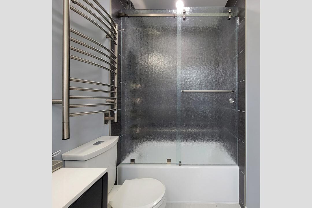 If you want a little more privacy, rain patterned glass is also a visually appealing option as seen here. The choice of glass instead of a shower curtain dresses up the tub/shower combo, and the rolling door function is very practical given the proximity of the commode to the shower area.
