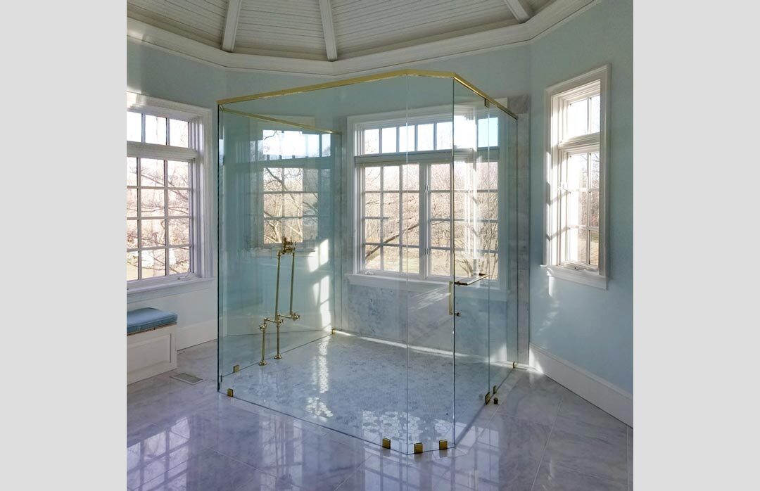 With all but one wall made of glass and a custom layout, this roomy enclosure has tons of wow factor. Clear glass maximizes the impact of the window and preserves the room’s open and airy feel. Brass hardware adorns the glass, giving it an even more high-end look.