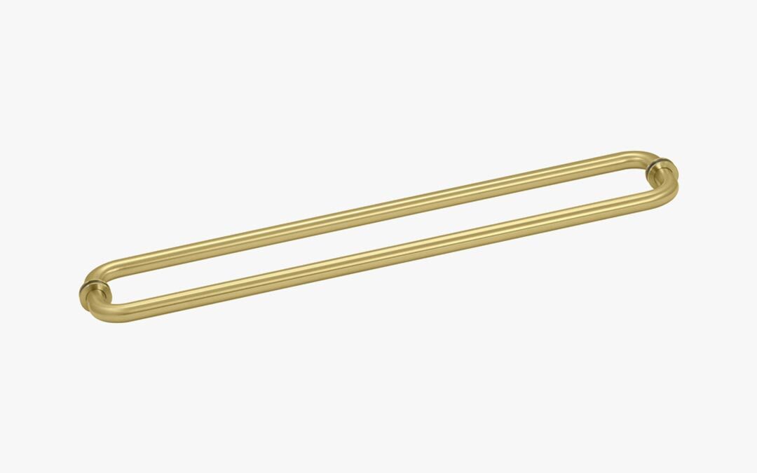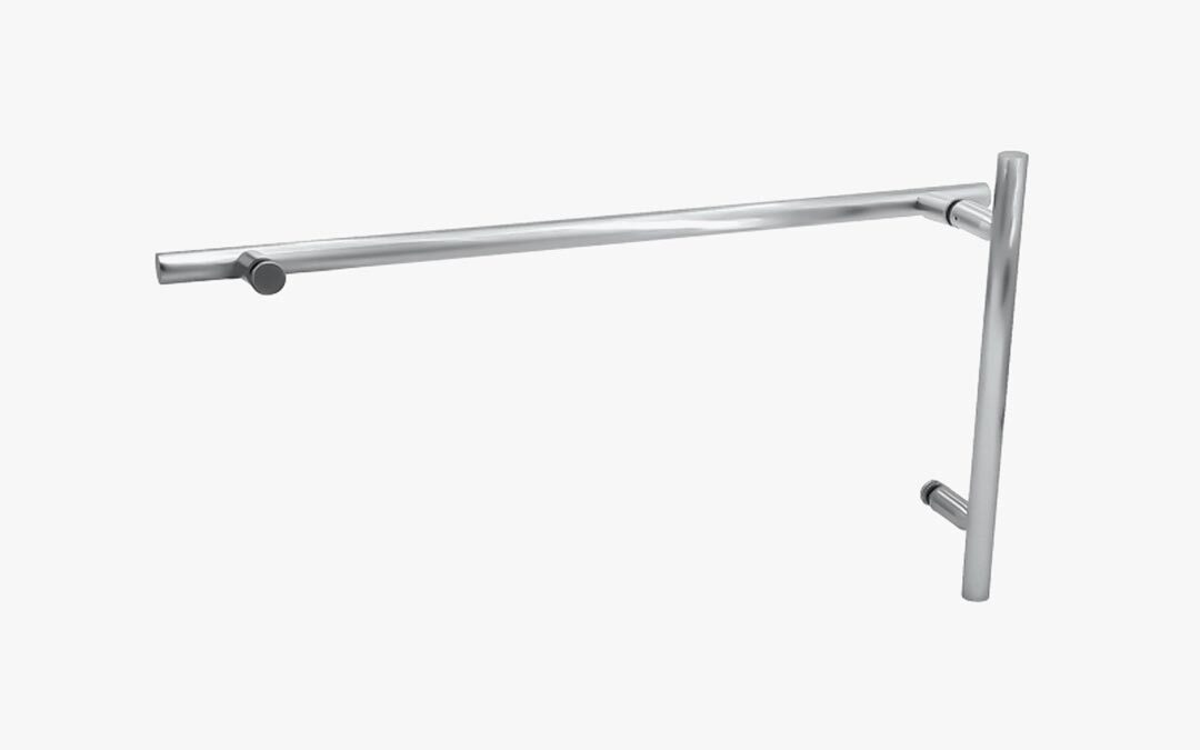 Next, a towel bar can be mounted on shower glass to serve as both a door handle and an extra towel storage option. Many towel bars mimic the pull handle styles like tubular, mitered, and ladder. Like pulls, you can often choose between a single bar and a back to back set. When ordering towel bars, pay close attention to the dimensions to avoid ordering a bar that is wider than the piece of glass on which it will be installed!