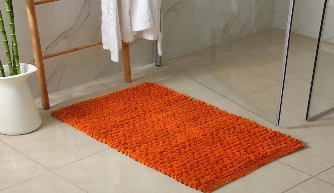 - Replace your existing bath mat with a new plush rug in burnt orange.