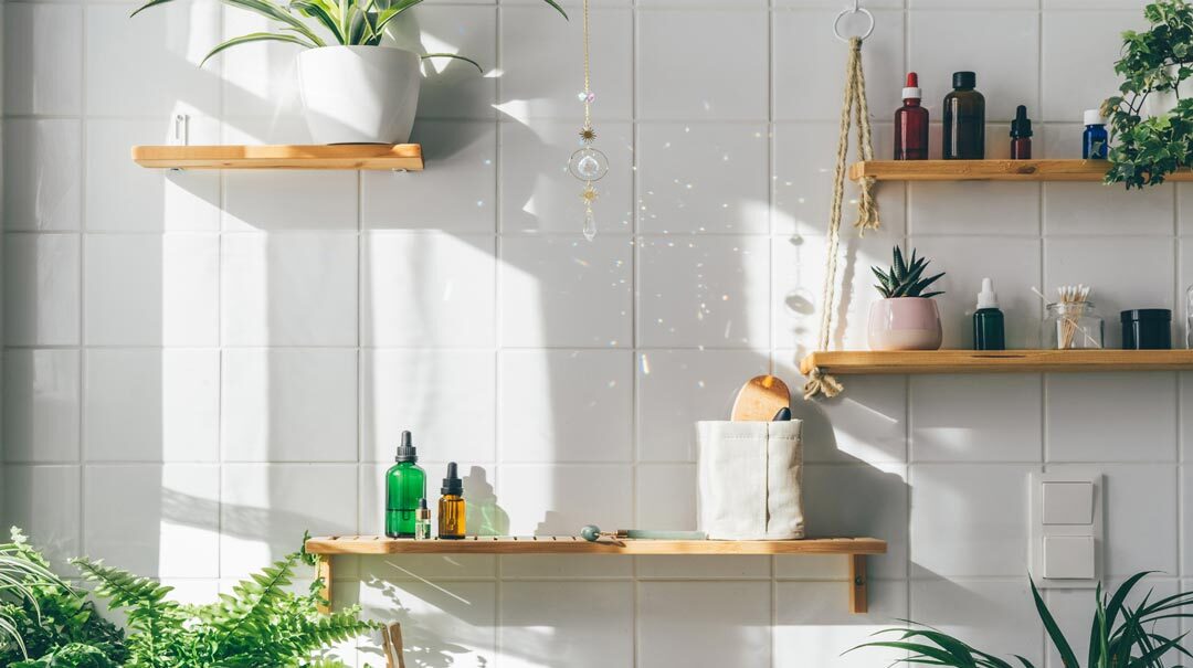 - Add a glass wall shelf on metal clamps and create a vignette on its surface.