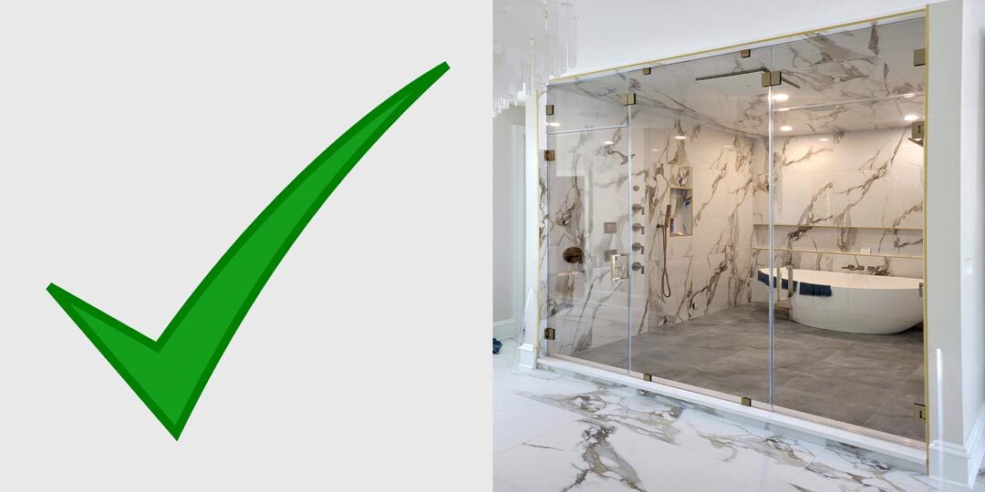 If you see a picture of a shower that seems to be almost truly “all glass” with hardly any metal fasteners, beware. Not everything that can be done should be done. It’s possible to construct a very low-metal glass shower that will hold up initially, but if industry standards were ignored the structure may fail over time.