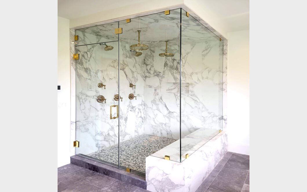 Besides the normal shower components, a steam shower has a steam generator and closes up completely with no space between the top of the shower glass and the ceiling. Steam enclosures are generally frameless, with glass held in place by clamps, silicone joints, and hinges. Steam units also include a transom that can be fixed or mounted on operable hinges so that it can be opened to release some steam. Inside the enclosure, it’s crucial that all surfaces be covered by a moisture-resistant material like stone or tile.