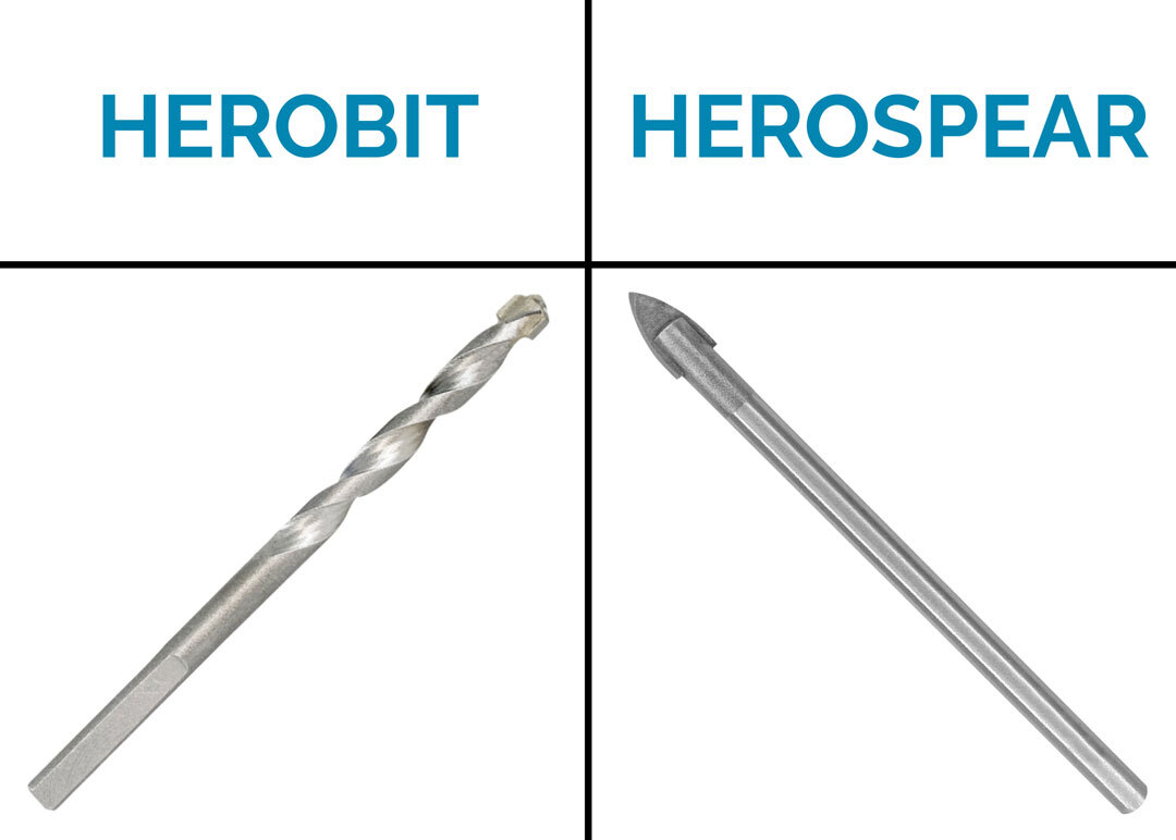 HEROBIT is our V-groove drill bit, and we also offer HEROSPEAR, a tungsten carbide tipped spear point bit for rotary drills. HEROSPEAR can also be used on porcelain tile, granite, marble, and glass and is available in two sizes – 3/16” x 2-5/8” and 1/4" x 2-13/16”.