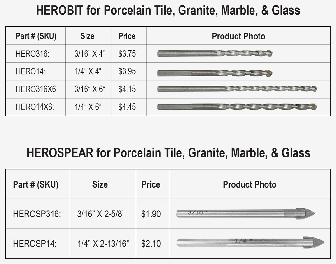HEROBIT is compatible with both hammer and rotary drills and can be used for drilling through porcelain tile, granite, marble, and glass. The HEROBIT is available in 4” and 6” lengths and in 3/16” and 1/4"widths.